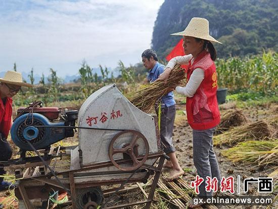 图为桂林移动党员志愿者在阳朔葡萄镇葡萄村委开展党日活动,帮助缺少劳动力的种植户和贫困户收割稻谷。 林彥杉 摄
