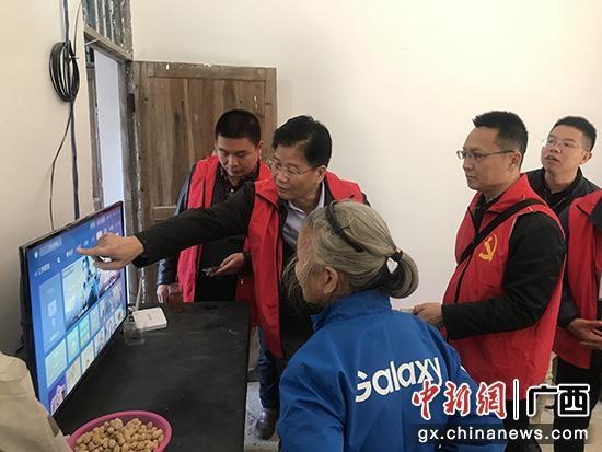 2020年10月,桂林移动爱心捐款帮助灌阳新圩镇龙塘村80多岁的孤寡老人房屋翻新,购买电视机,安装了宽带及魔百和。图为桂林移动副总经理谭志忠教莫奶奶收看天气预报 陆建军 摄