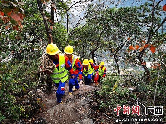 图为桂林移动网络建设人员翻山越岭开展县乡网络建设。 徐先丽 摄