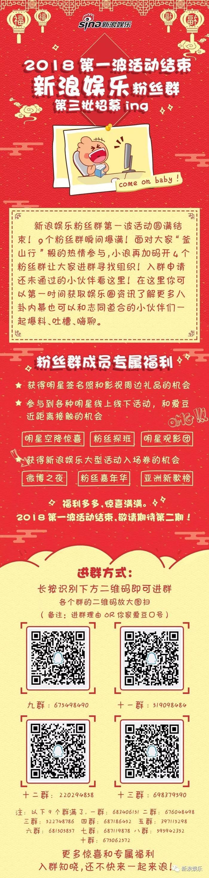 新浪娱乐粉丝群开通啦!想第一时间获取娱乐资讯吗?想认识更多志同道合的小伙伴吗?想和你的爱豆近距离接触吗?快来加入我们吧。ps,12群已满,13群还有少量名额!
