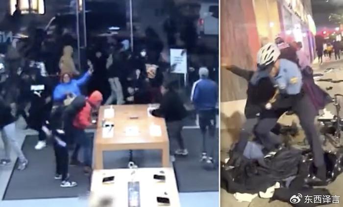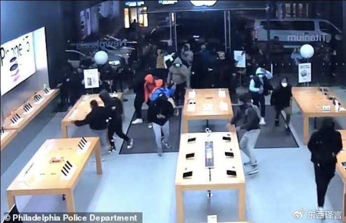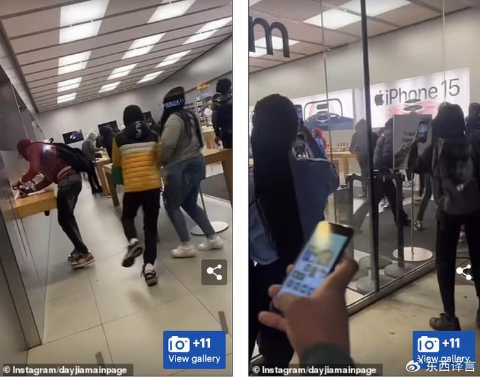 早前,苹果商店公布了店内的部分视频,可以看到iPhone和各种苹果电子产品被从展示架上粗暴地扯了下去,工作人员站在劫匪旁边,满脸茫然。