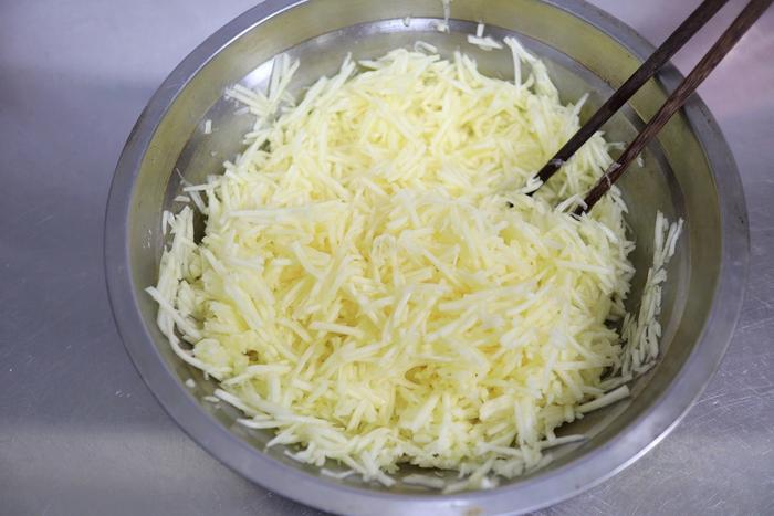 4. 南瓜去皮、去籽,用擦丝器擦成细丝,撒1克左右的盐,拌匀,静置5分钟;