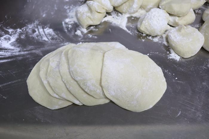 9. 擀成中间稍厚、边缘略薄的圆皮;