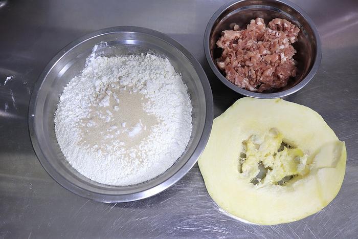 1. 面粉、南瓜、肉馅准备好;南瓜不限品种,老嫩、黄瓤白瓤均可;