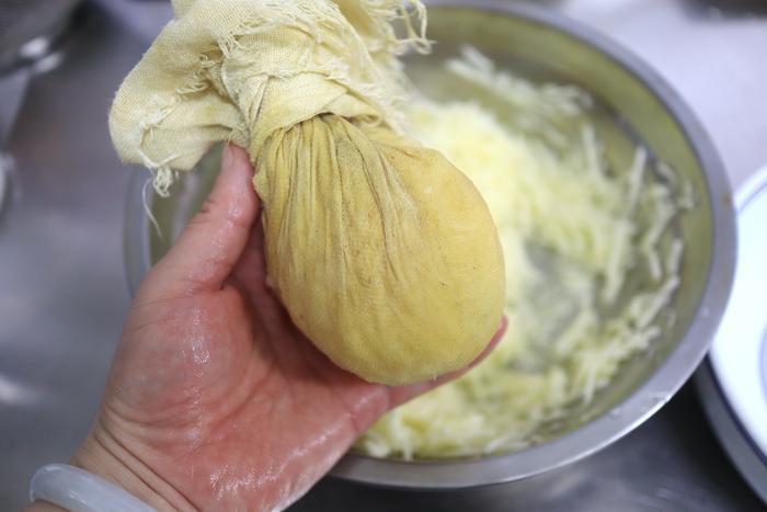 5. 肉馅中有酱油汁,所以南瓜丝要攥得干一些,将南瓜丝放在纱布里,用力拧一拧,多余的南瓜汁就挤出来了;如果用生肉馅这步可省略;