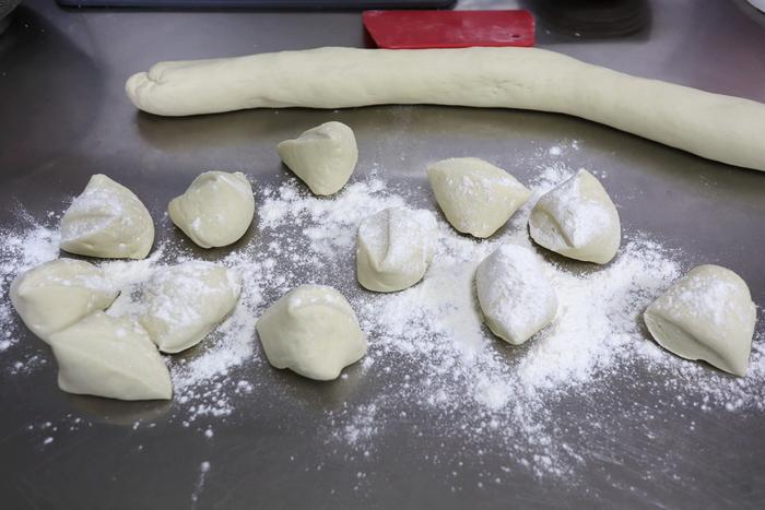 8. 面团放案板上,撒少许面粉稍用力揉3分钟左右,搓成长条,切成大小均匀的剂子;