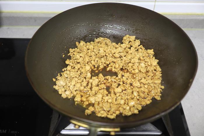 3. 热油凉油,肉馅倒锅里,迅速用铲子划散,待大部分变色后,倒适量酱油增色提香,有一些汤汁也不要紧,晾凉使用;