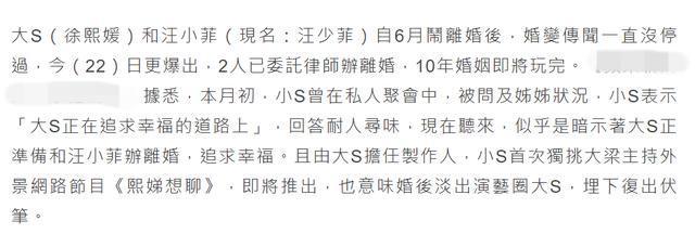 对于汪小菲9月飞到台北替妻子大S过生日的说法,也被台媒更正为“谈离婚细节”。