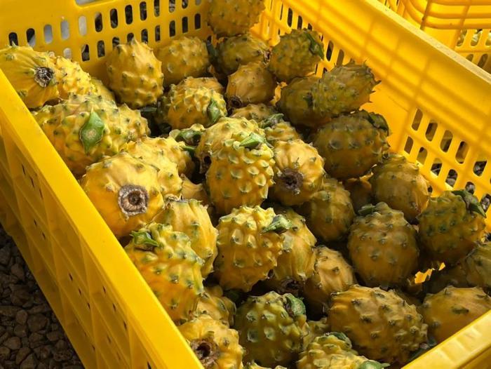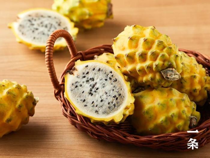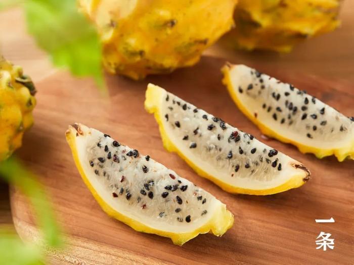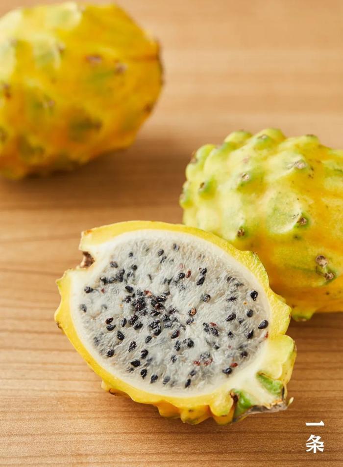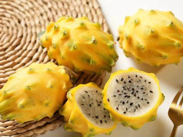 燕窝果也叫“麒麟果”,属于仙人掌科,与火龙果是亲戚关系。它的外皮是黄色的,果肉是白色,口感像燕窝,所以也叫“燕窝果”。