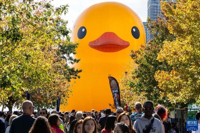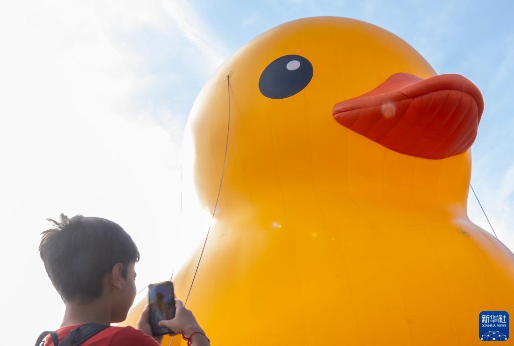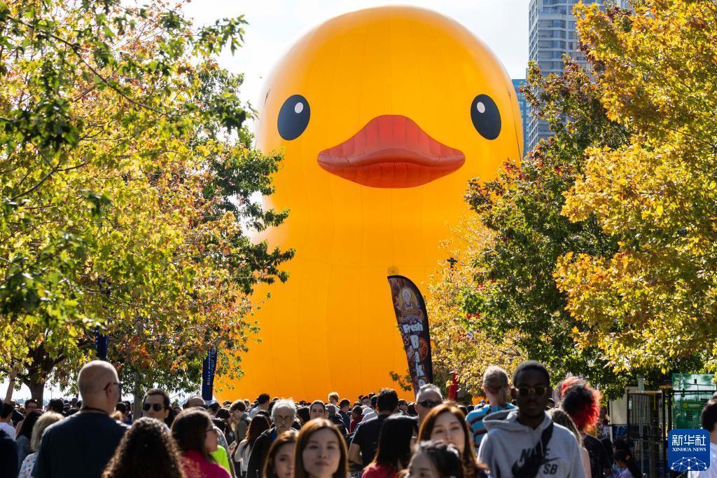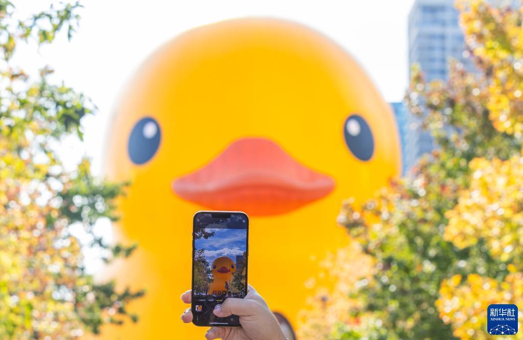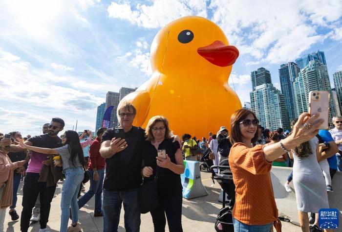 9月16日,游人在加拿大多伦多与“大黄鸭”自拍合影。当日,一只6层高、重约13.6吨(30000磅)的橡皮“大黄鸭”亮相多伦多,吸引了众多游人。这是“大黄鸭”继2017年后再次来到多伦多,从9月16日至17日向公众开放。新华社发(邹峥摄)