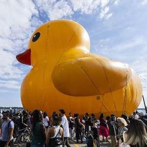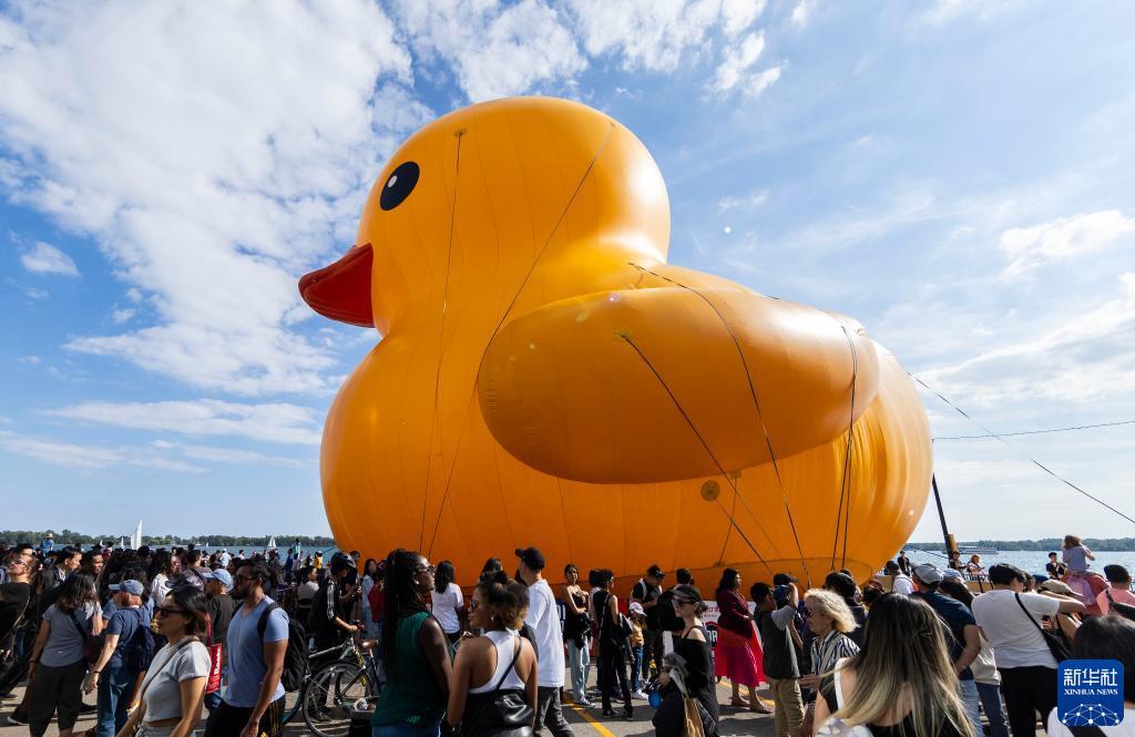 “大黄鸭”亮相多伦多---9月16日,一只6层高、重约13.6吨(30000磅)的橡皮“大黄鸭”亮相多伦多,吸引了众多游人。