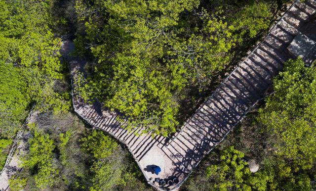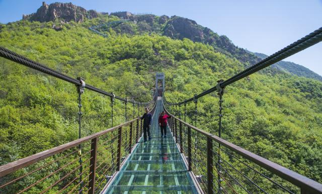 在景区的玫瑰岭登高望远,看日出、观云海,三泉湖壮美的景色尽收眼底。一条山间栈道直通山底,美名曰:凤凰天阶。由于山势比较陡峭险峻,从这里到达玻璃吊桥需下行800多级台阶。