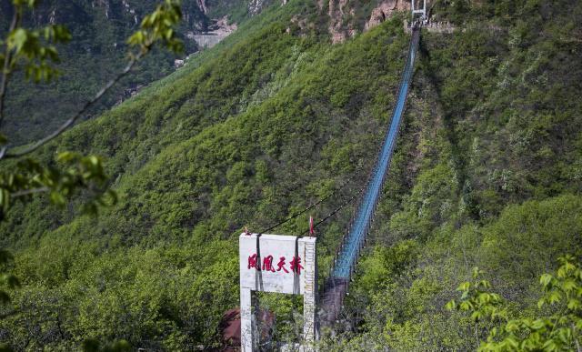 这里还有中原首座玻璃吊桥,这座悬索玻璃吊桥全长210米,是通往凤凰峡谷的必经之路,对于我这种恐高的人真是有种步步惊心的感觉。不过透过玻璃往下看,沟壑间的枝丫、奇石清晰可见。真可谓:拾云高山上,踏险万壑中;快意人生路,天堑变通途。