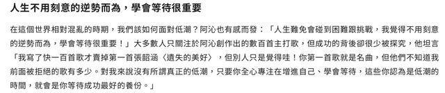 在专访中,感受到陈建宁和阿沁成熟,也沉淀了很多。被问及如何面对低潮,阿沁表示人生难免遇到困难和挑战,学会等待很重要。
