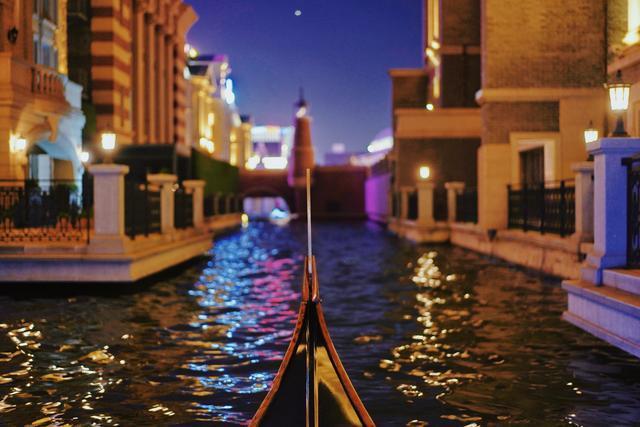 夜晚,一座座城堡、歌剧院的霓虹亮起,夜色中熠熠生辉,水波中泛起幻彩的倒影,贡多拉划过夜色弥漫的波浪,时而穿过水漫的阶梯,时而钻进低矮的石桥,时而掠过低垂的枝叶,处处是小惊喜。