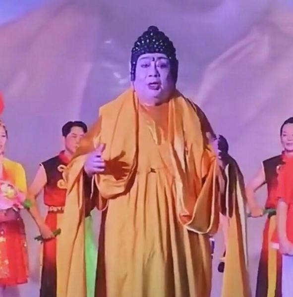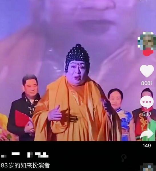 画面中,朱龙广站在舞台上,身穿金色袈裟再扮“如来佛祖”,不论是又大又厚的耳垂,还是眉心的红痣,和《西游记》中的模样几乎没有太大的区别。82岁的朱龙广虽然有些弯腰驼背,身形也变得圆润,但他的精神状态非常不错。