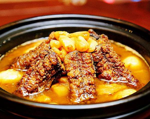 三套鸭的当地非常有名,这道菜制作的工艺比较复杂,世家鸭里面套上野鸭,然后野鸭里面再套上鸽子,再配上很多秘制的调料蒸制而成,吃起来口味各有不同,越吃越鲜。