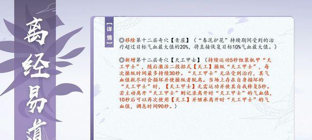 万花改动的技能叫天工甲士,说直白一点就是操纵机器人,谁能想到,悬壶济世的万花居然也有开机器人的一天,相当于召唤物了吧,仔细一想这个技能是能给万花带来优势的,万花的缺点就是脆皮,而这个机器人刚好可以为万花抵挡伤害,防止对方爆发性的输出,也就是不会让万花在竞技场沦落到非常惨的地步,我身为一位万花玩家,对这个新的技改还是很看好的,等到正式上线再看看该技能是不是鸡肋。