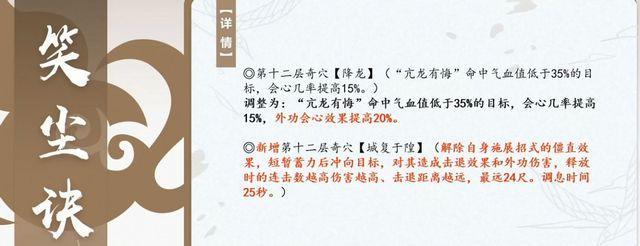 还有这次技改笑的最大声的就是丐帮玩家,以前官方就一直有调整丐帮技能的想法,这次终于实现,而且能明显看出官方对丐帮技改上心,以前丐帮技能的描述只有短短几句,现在的技能描述多到眼花缭乱,虽然看不太懂,但是厉害就完事了,玩过丐帮的玩家都知道,丐帮有个技能叫笑醉狂,使用笑醉狂之后能给自身恢复一定的血量,这次技改之后官方还给这个技能增加了一项,就是能奶队友了,这就极大的为队友的生存环境提供了保障,丐帮玩家直接起飞。