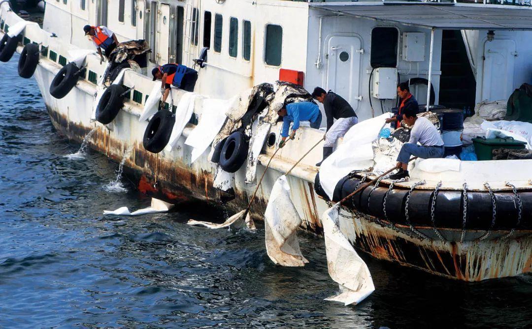 本刊记者看到的,无疑是最“原始”的一种清污方式。而据大连海事局向本刊介绍,目前主要采取四种方式清理油污:在溢油水域布设围油栏杆;组织清污船作业;向海里抛清油毡;对于油膜特别薄的区域,则通过喷洒消油剂把油污分解成更小的颗粒。对于消油剂是否会对海洋造成二次污染,海事局相关人员解释说,喷洒消油剂主要是将油分解成微小的颗粒,利用海洋自然环境,以生物降解等多种途径,解决油污对海洋环境造成的污染。