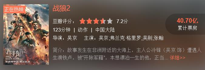 吴京导演的《战狼2》电影,票房已经突破了40亿,现在的排片量依然占33%。