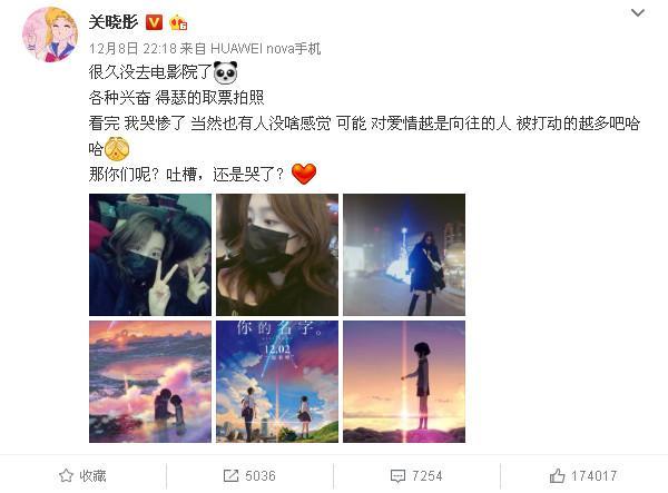 关晓彤看电影露腿 看新海诚《你的名字》哭惨了