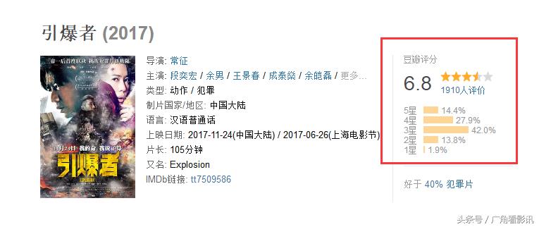 然而,另外一位知名硬汉段奕宏的新片《引爆者》虽然豆瓣拿下6.8分,但是票房却位居第四名,目前仅约1100万的票房。