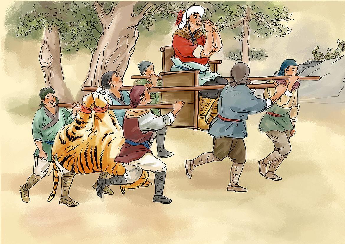 武承休走后,七郎又是彻夜难眠。第二天早上,他多带了好几份的干粮,一头又扎进了深山。功夫不负有心人,经过好几夜的蹲守,田七郎终于打到一只猛虎。他背起整只猛虎,送到了武承休家里。