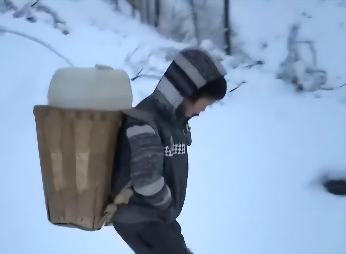 从这里往下看,整个山村被大雪覆盖,入眼之处一片雪白。这样的一幅美景,因为一个小人儿的出现变得有些荒凉。那人不足1米5,背上勒着四五十斤重的水桶,步履沉重的往山上走着。因为路滑,几乎走几步就会摔跟头。小人儿一次又一次爬起来,坚定的朝山上走去,对摔倒仿佛习以为常。