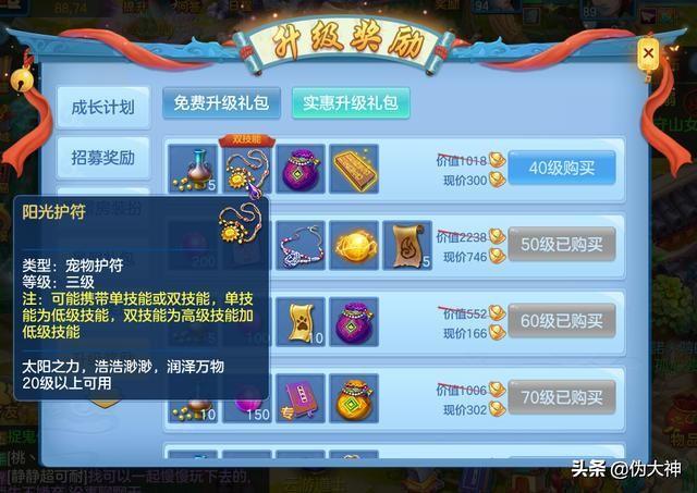 随着大家慢慢提升等级,每10都会有一个免费领取的礼包以及一个只需要少量金币就可以获得的礼包,在这些礼包中都是我们在当前等级非常实用的物品,比如说在40级时可以解锁一个包含了一个双技能三级护符以及聚宝盒的礼包,尤其是聚宝盒对于大家来说每天不仅可以获得更多的奖励,还能够节省很多时间,是非常实惠的。此外像50级的时候解锁实惠升级礼包也是一个不错的选择,大家可以通过高级通灵丹来获得一个变异宠物。
