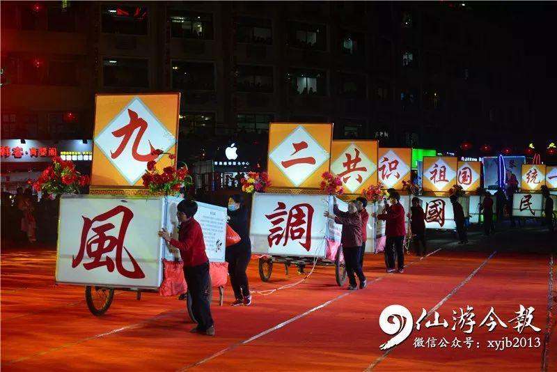 当晚七点四十多分,枫亭兰友社区元宵游灯队伍穿行千年古镇枫亭街后,来到枫亭蔡襄雕像广场前。开道方队中,锣鼓喧天的兰友社区女子车鼓队,大红灯、手提灯、宫花灯,彰显了民俗文化的源远流长;五色旗、龙虎旗、列圣旗、列圣灯,显示了中华民族文化的多彩多姿。彩灯方队中有传承三百多年的“蜈蚣驱邪灯”,是明朝左副都御史林兰友指导乡民,依照宫廷长廊挂灯所制作的特色彩灯;也有全国独有的枫亭“花盆菜头灯”,由民间艺人依照宫廷花盆缀灯的形式,以榕树枝叶制作花盆,用白萝卜雕刻成各式各样的灯盏,装上灯火,如同一朵朵盛开的莲花;还有独具地方特色的传统灯艺,原以宫廷树木挂灯的形状,制成伞型灯具的“宝伞灯”,后以松树为灯架,分为五层,可挂彩灯50-60多盏。