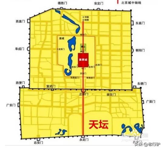西安圜丘在隋唐长安城中轴线南门——明德门以东950米处。北京天坛也在中轴线偏东一点。(下图)