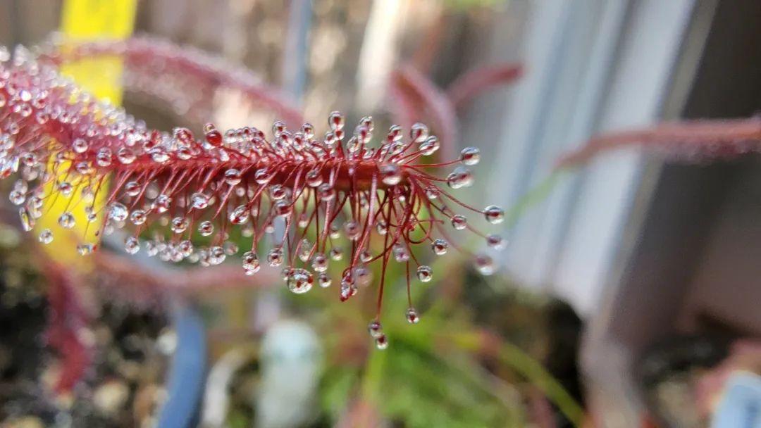 茅膏菜的颜值是比较高的,但它们对一些小昆虫来说,就是比较致命的,它们的叶子上长满了腺毛,腺毛上有很多“露珠”,其实那些就是粘液,可以吸引虫子过来,从此会被粘附在“露珠”上面,最终虫子会被消化。