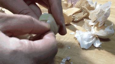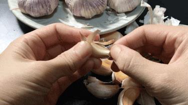 如果大蒜瓣上面的蒜衣没有裂痕的话,我们可以用另外一个方法,拿起一个蒜仁,把大蒜夹在两只手的拇指和食指之间来回的拧几下,像拧衣服衣服一样,这样蒜皮就松动了而且有了裂痕,用手轻松的就把蒜皮剝下来了。两三斤大蒜十来分钟就能剥完,非常的方便。并且这样做可以直接省去最后切掉蒜根的步骤。