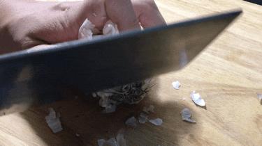 蒜根去掉之后,我们把整颗大蒜放手心上,然后用力地揉抓几下,这样蒜上面的外皮就轻松去掉了。
