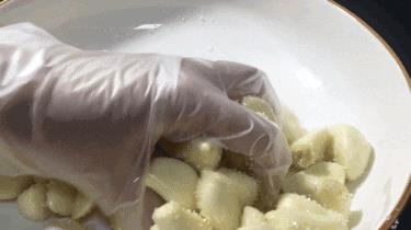 接下来我们带上手套把它抓拌均匀,在抓拌的过程最好带着手套,因为食盐和糖的颗粒都比较粗糙,如果直接下手抓拌的话就会把手指磨粗糙。抓拌的时间一定要长一些,大概三五分钟,一定要把蒜表皮稍微打湿。把蒜里面的水分稍微杀出来一些,这样吃起来口感就会更佳清脆,抓拌均匀之后放一旁腌制15分钟左右。