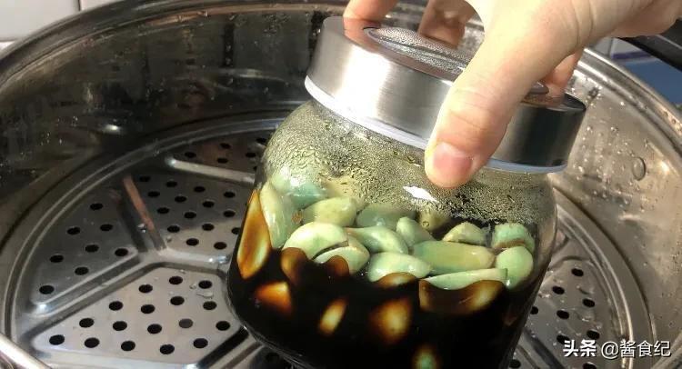 三个小时之后我们将瓶子取出,然后把蒸锅里面的水加热到五六十度左右,再把瓶子放回蒸屉上,盖紧锅盖,让它继续在里面保暖三到四个小时的时间。这种方法也可以让腊八蒜快速变绿,而且口感也是十分的清脆。