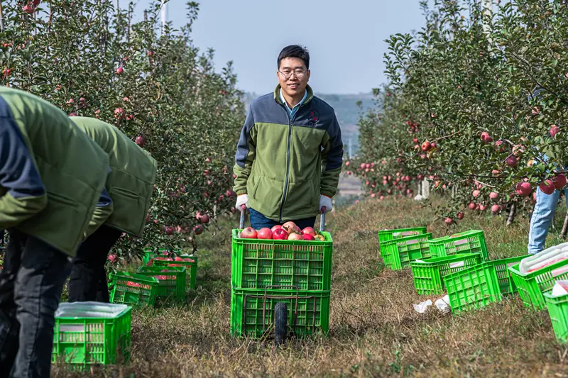 陈冲在基地采收苹果。