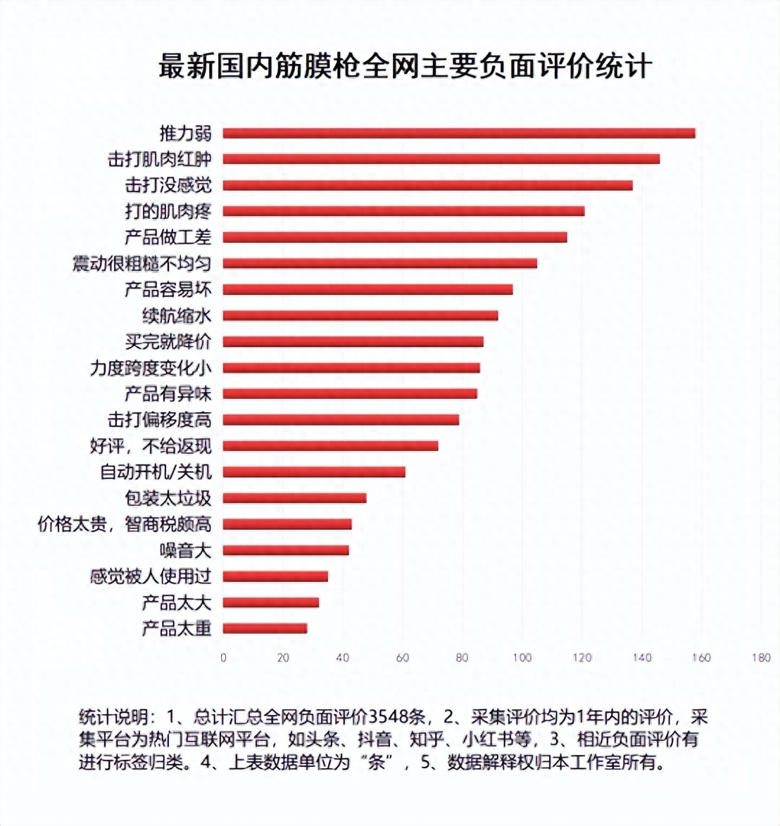 下图是国内关于筋膜枪最新的负面舆论数据榜单,大家可以看一下常见的筋膜枪槽点都有哪些: