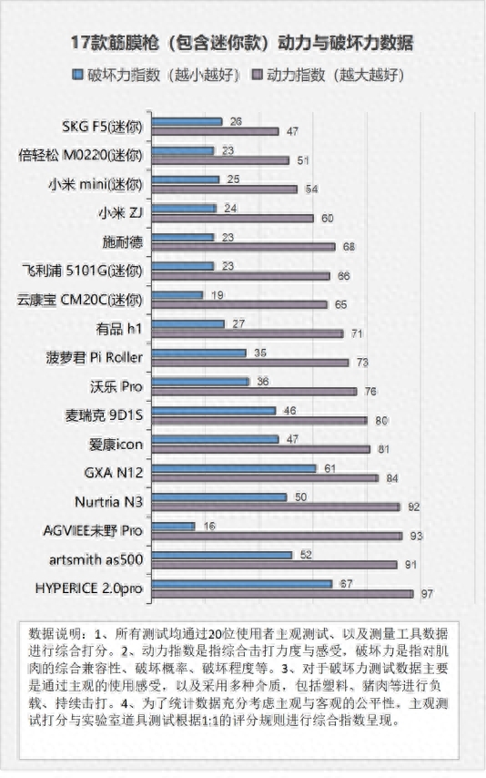 下图是根据20位使用者主观感受绘制的17款筋膜枪动力与破坏力的数据统计图,还包括几款迷你枪型,大家可以参考一下: