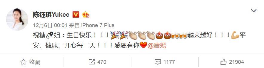 唐嫣生日,陈钰琪还发了微博祝福,但是唐嫣没回复……