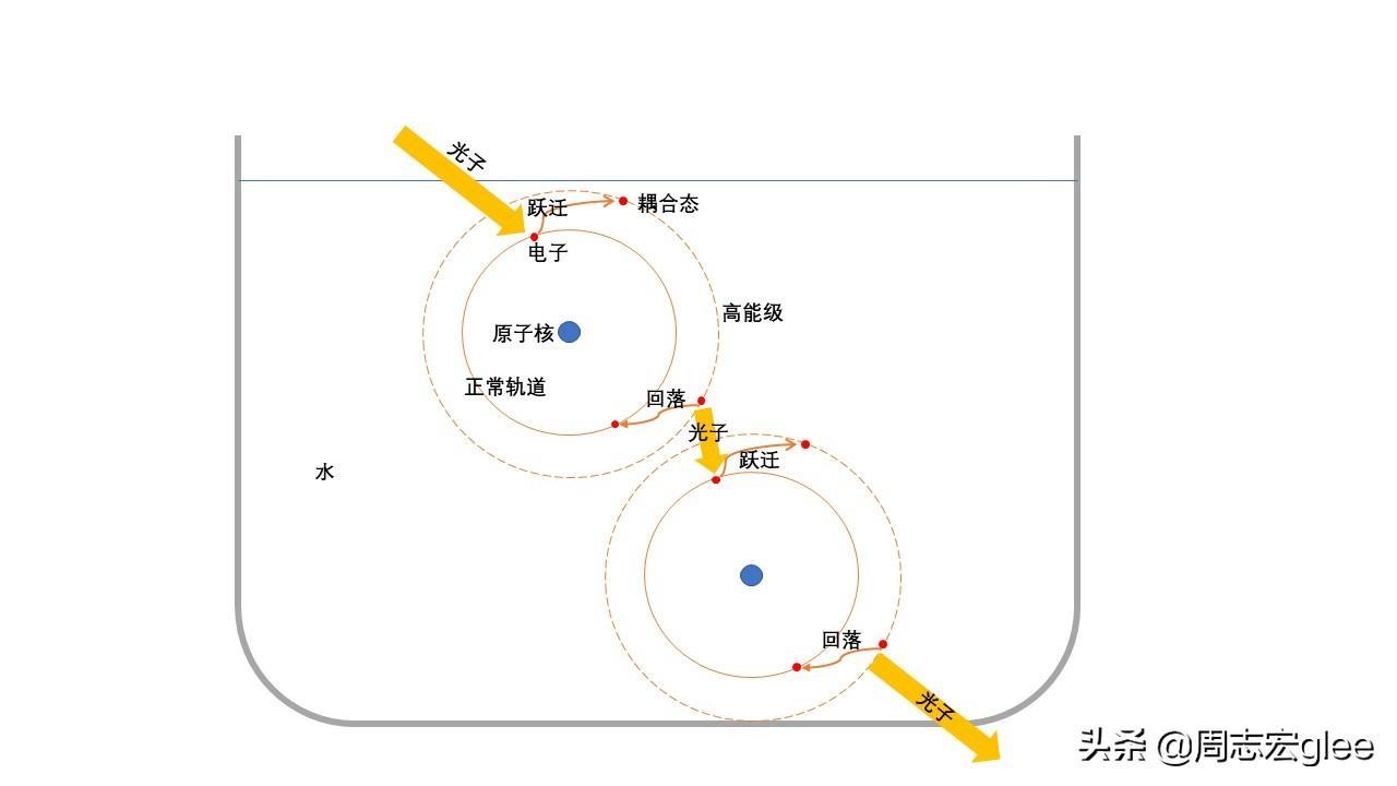 与此同时,那些到了高一级轨道的耦合电子并不稳定,它们有回落(回落也是跃迁)到原来轨道的趋势,在回落的同时,电子会向外释放一个光子,这个光子虽然与前一个耦合的光子不同,但它所携带的信息几乎与前一个光子一样。光就是以这样接力的方式不断在水中接力传输,直到重新被射出水。