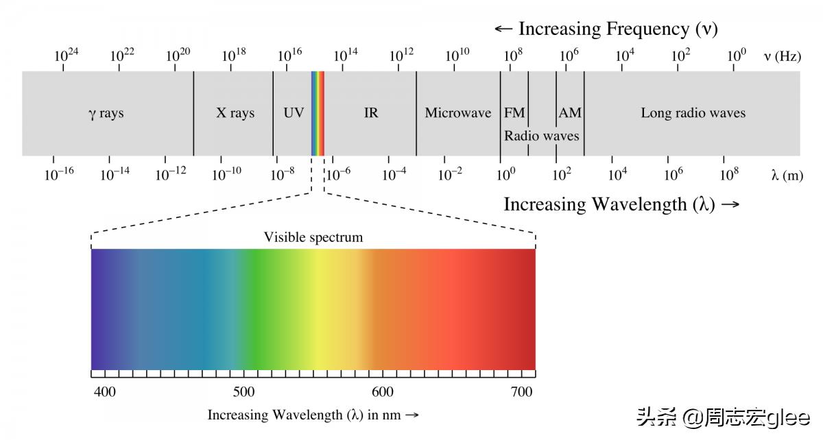 由上图,我们肉眼可见的自然光属于可见光,它只占整个光谱的很小一部分。可见光的波长大约在380~780nm之间,其频率范围大约为4.2×10^14~7.8×10^14Hz。
