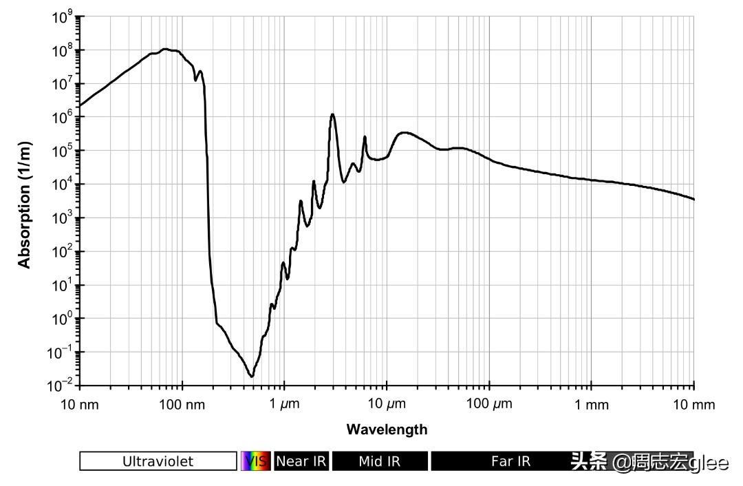 从这个吸收能谱上我们看出:紫外光波段中大部分会被水吸收;从近红外波段到中红外波段,水的吸收率升高;而到了远红外波段水的吸收率又呈现逐步下降的趋势;对于可见光,水的吸收率是最低的。