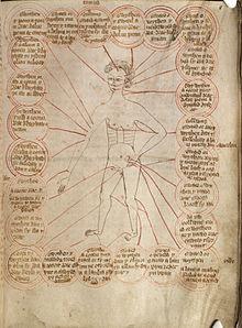 这是显示人体不同放血点以对应治疗不同疾病的挂图(约1310年–1320年)