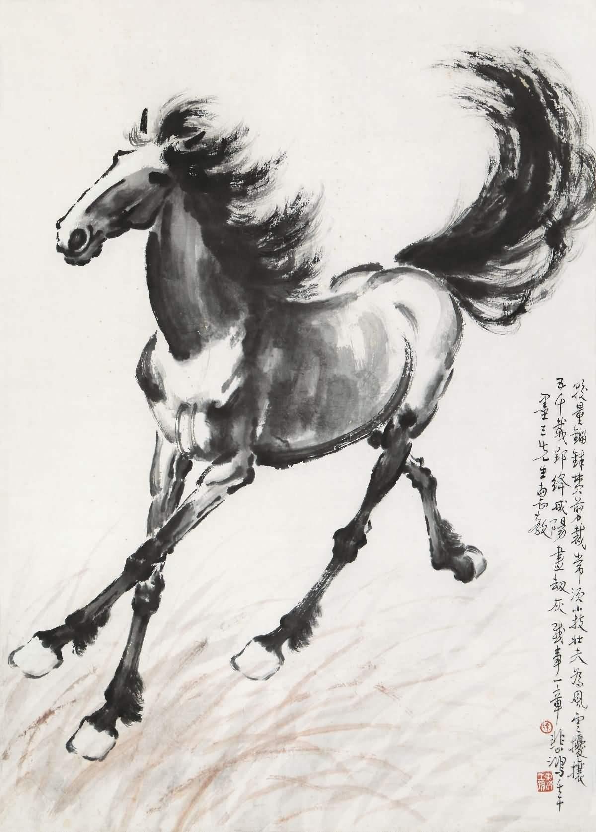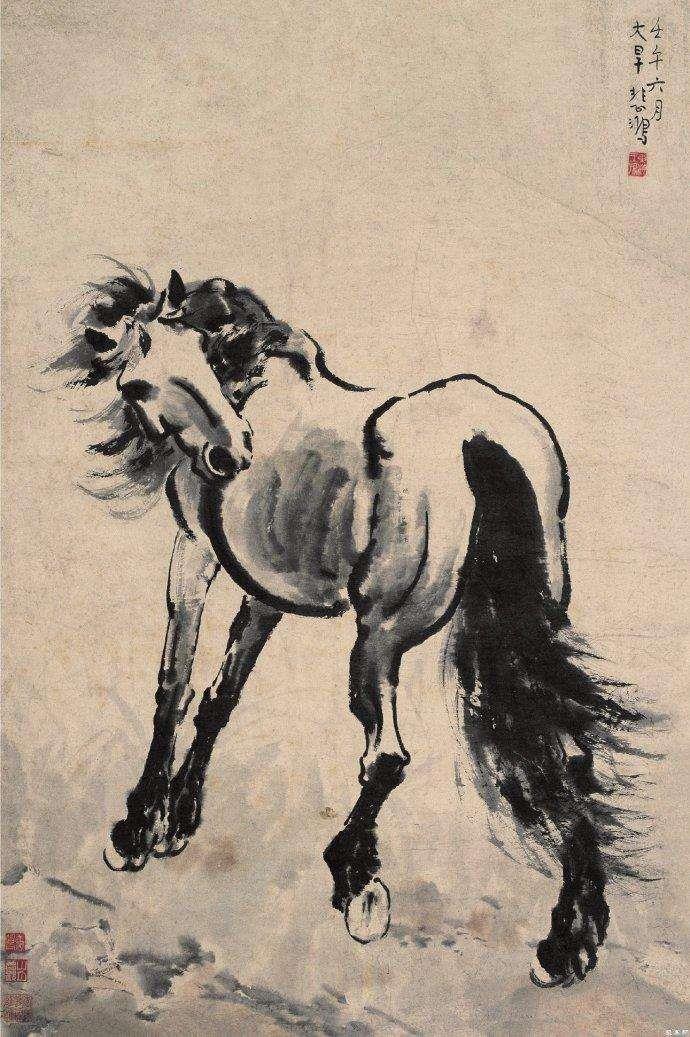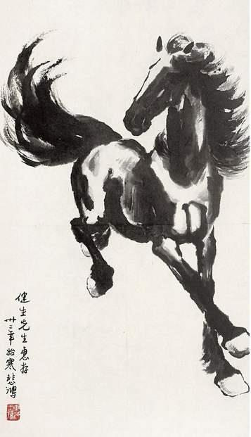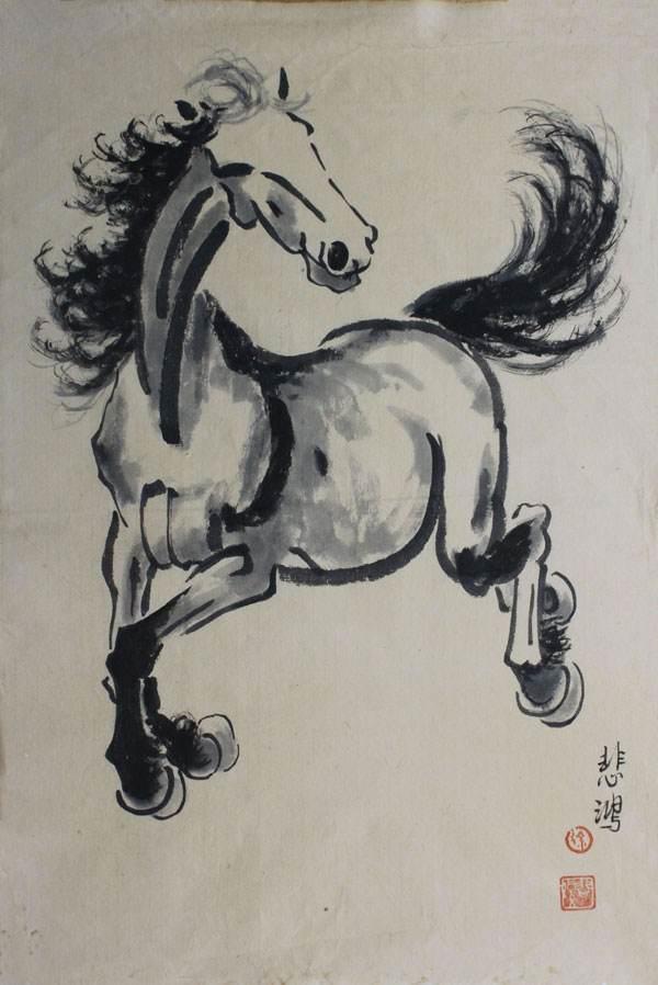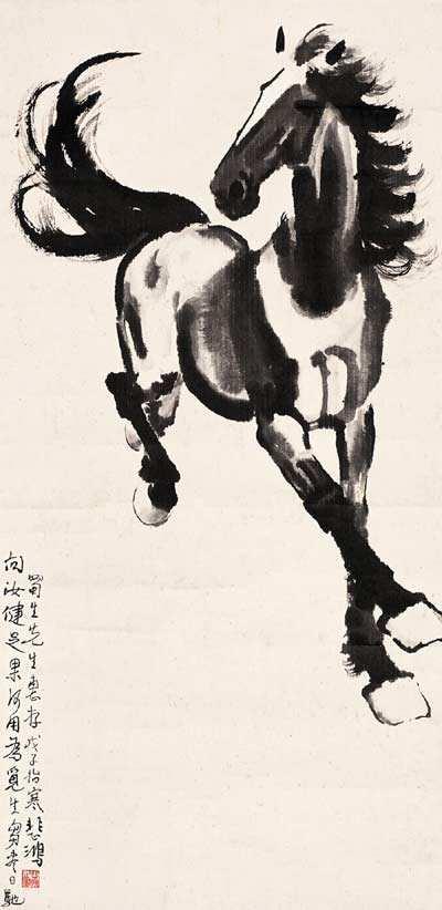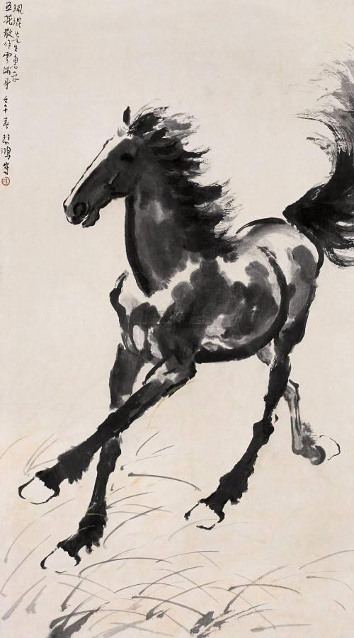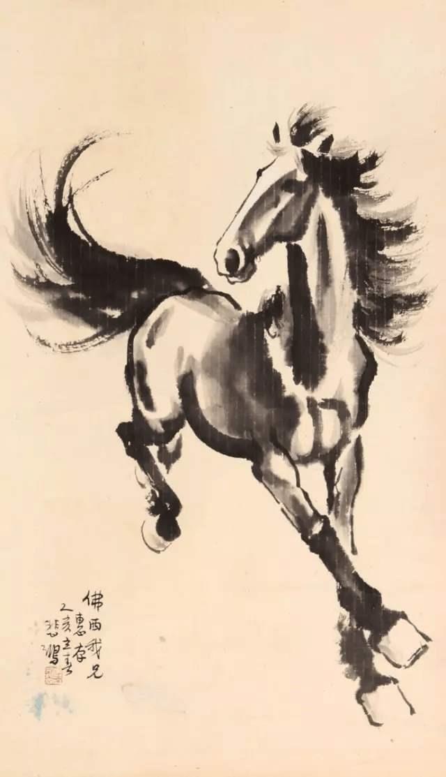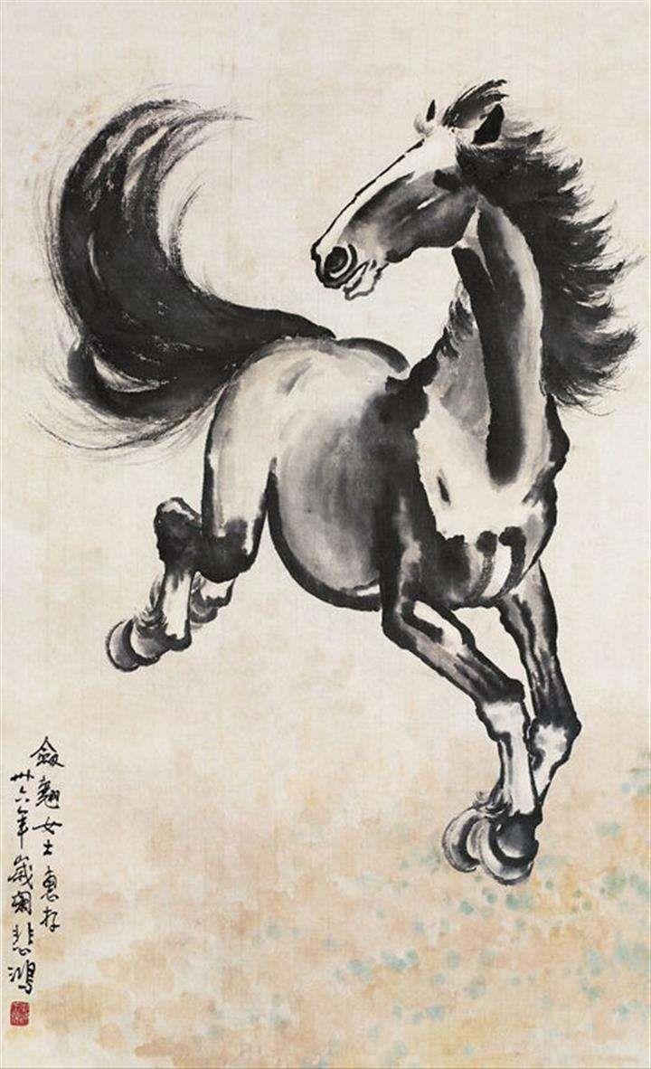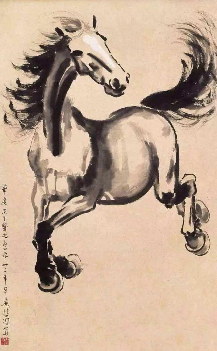 徐悲鸿自幼随父学习绘画,四岁入私塾。后又留洋法国,深得西洋绘画的技法,并系统学习了西方绘画的理论,在西方素描的透视关系、空间关系、光影关系的处理上驾轻就熟,并将西方的绘画理论与东方绘画的技法结合起来,产生了独特的笔墨效果。徐悲鸿所画的奔马图以形神兼备著称,奔马的神韵跃然纸上,整体造型俊朗丰满。