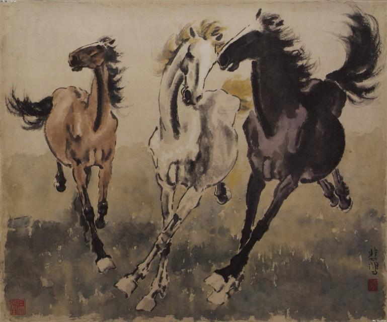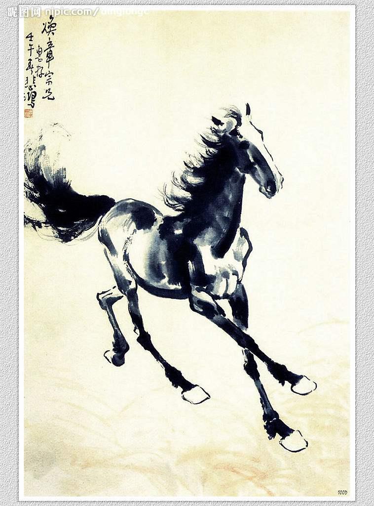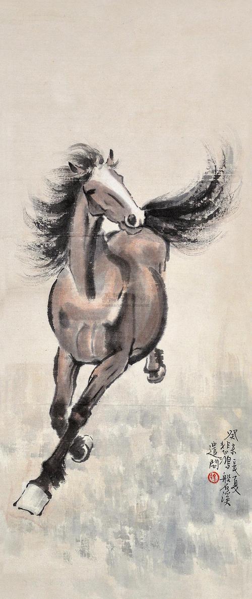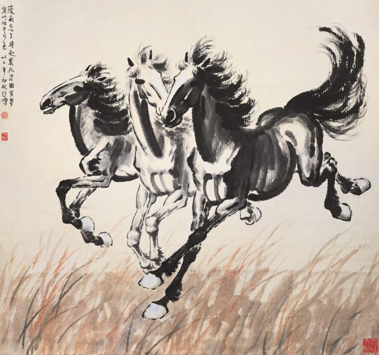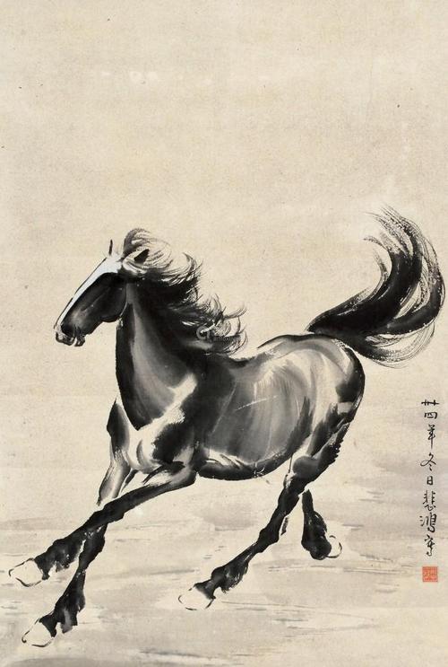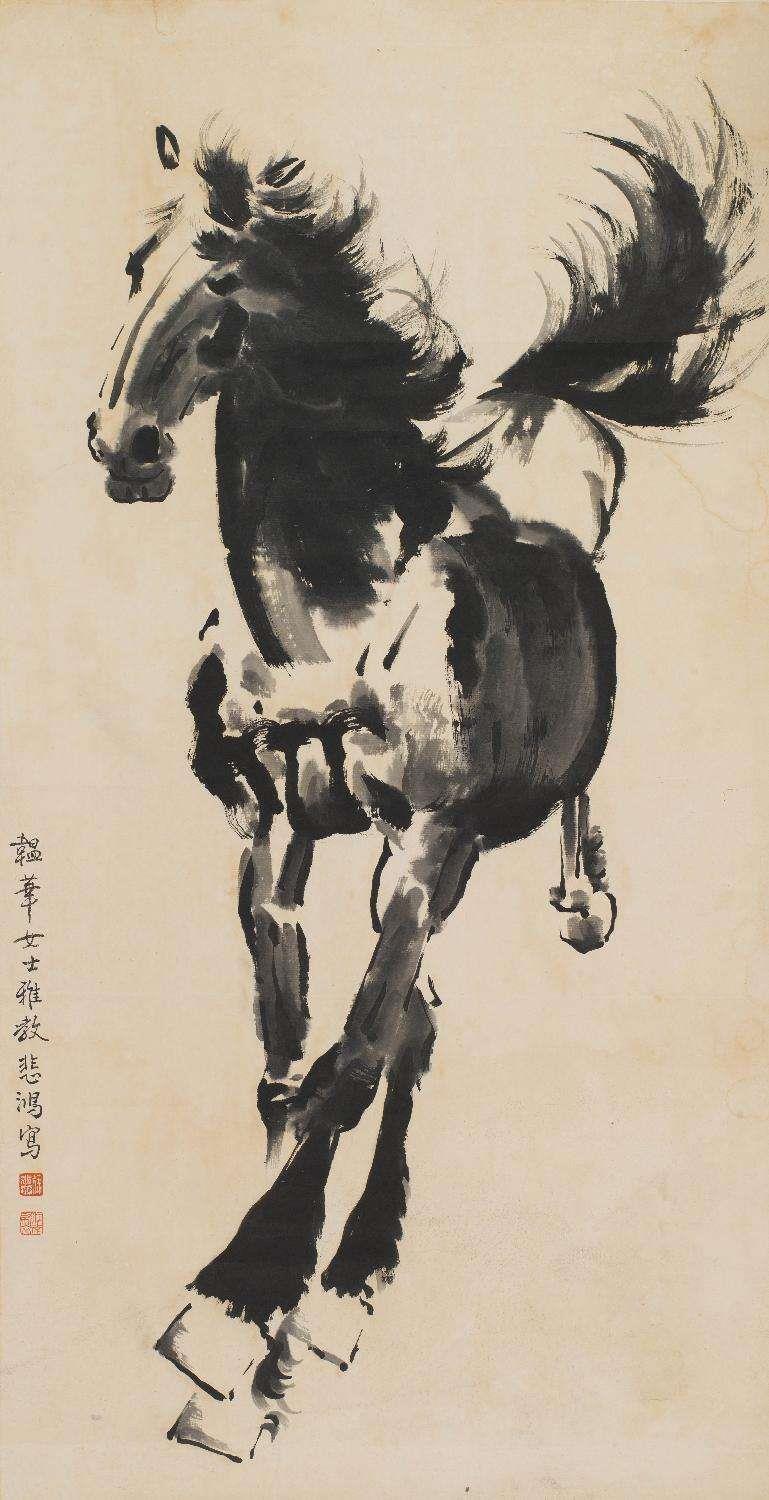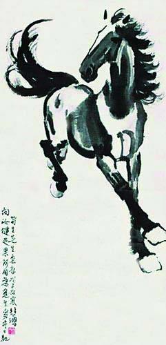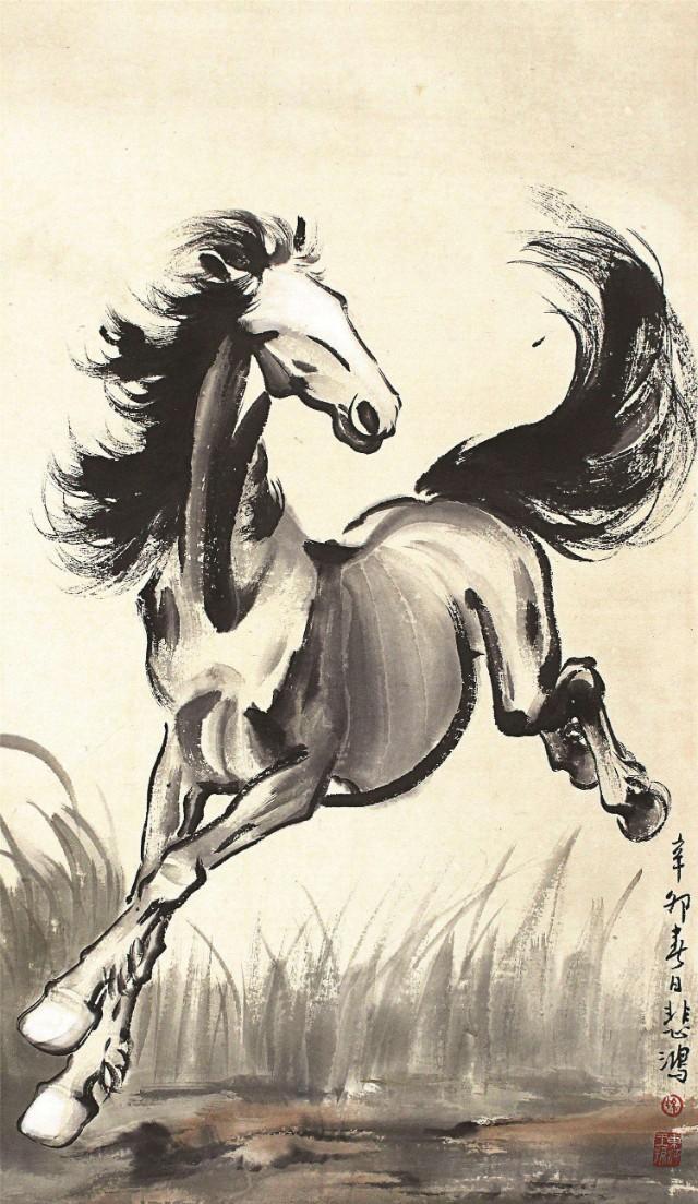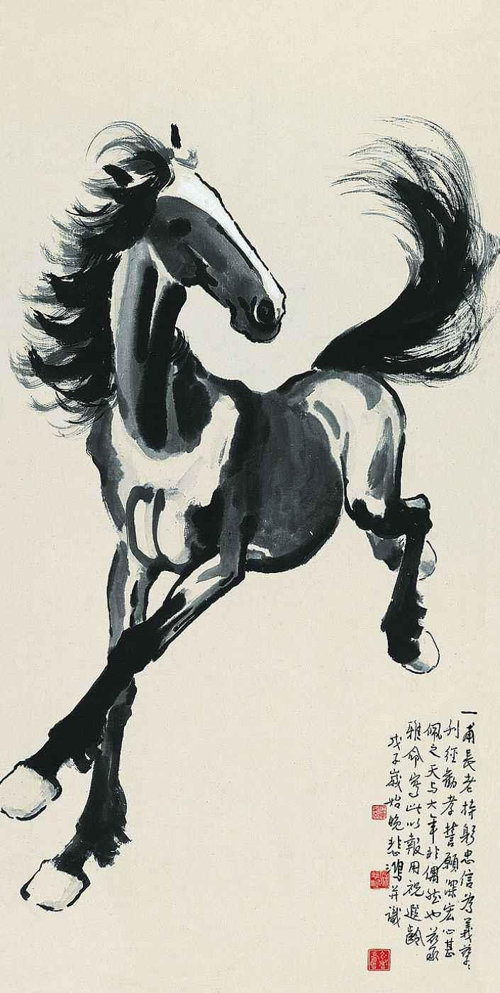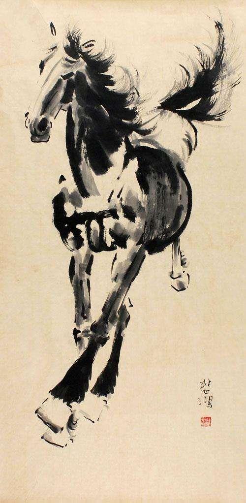 徐悲鸿自幼随父学习绘画,四岁入私塾。后又留洋法国,深得西洋绘画的技法,并系统学习了西方绘画的理论,在西方素描的透视关系、空间关系、光影关系的处理上驾轻就熟,并将西方的绘画理论与东方绘画的技法结合起来,产生了独特的笔墨效果。徐悲鸿所画的奔马图以形神兼备著称,奔马的神韵跃然纸上,整体造型俊朗丰满。