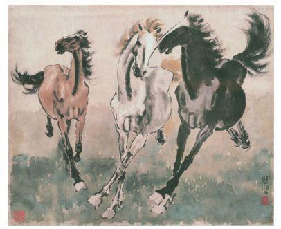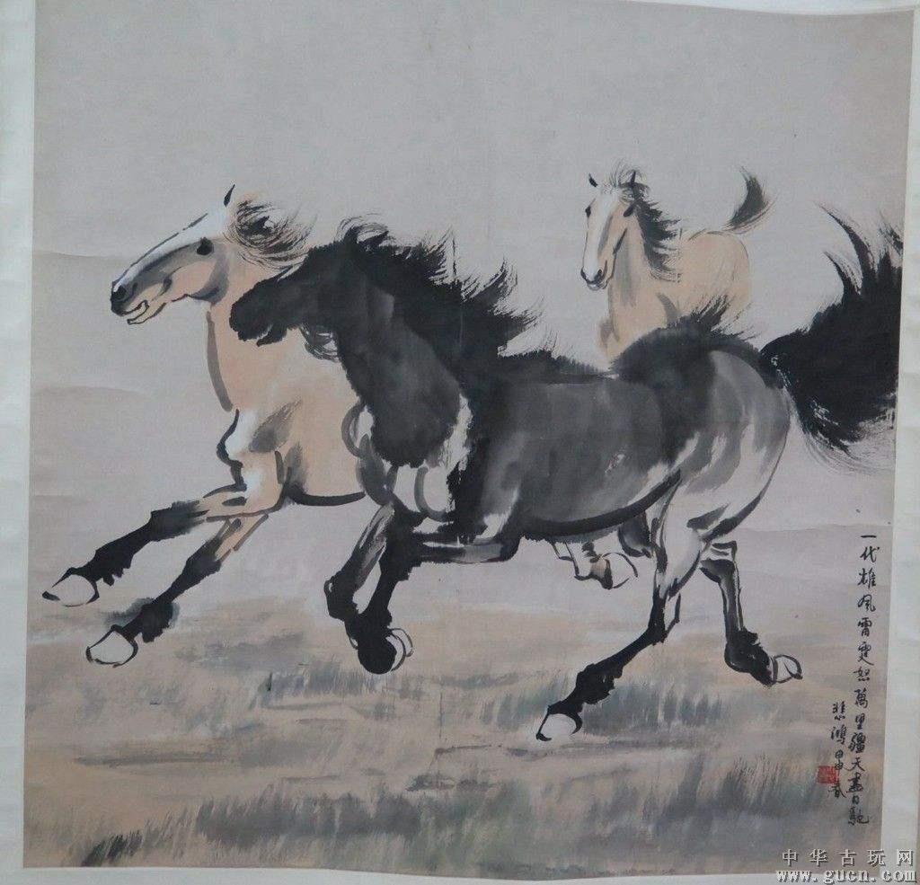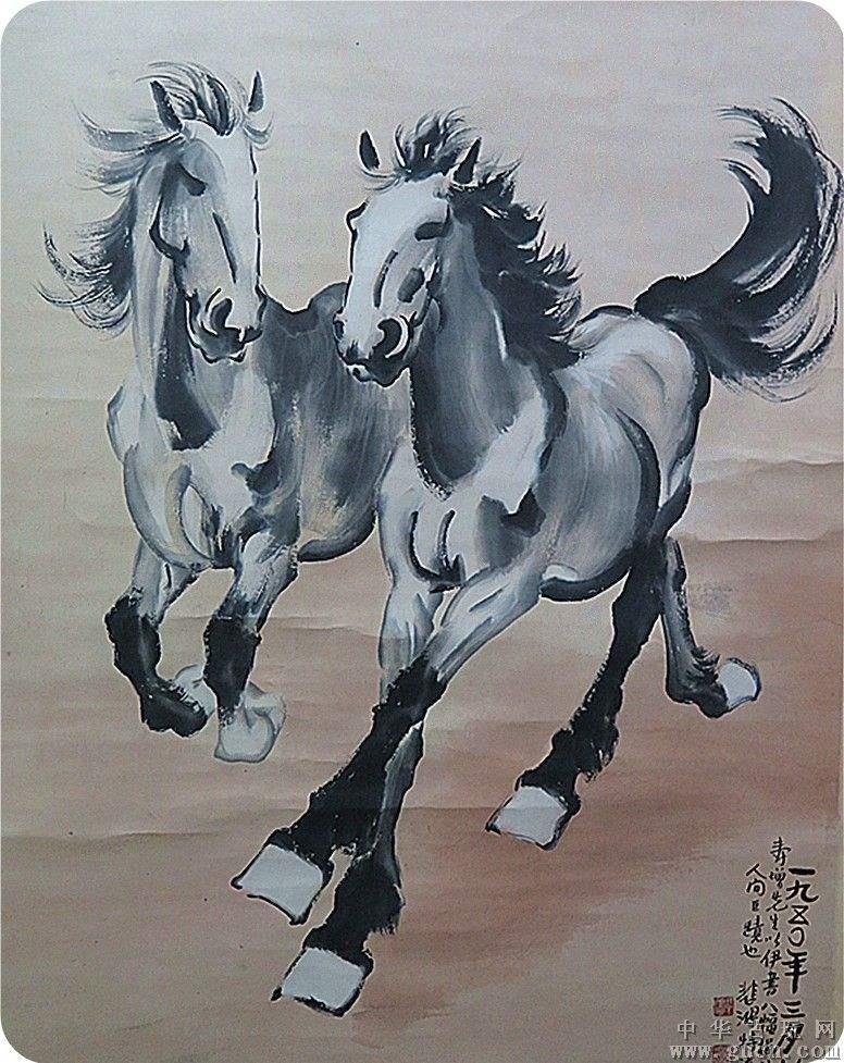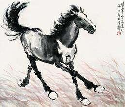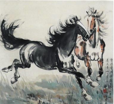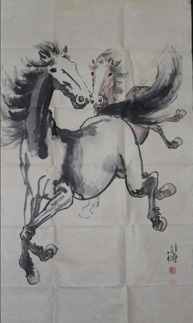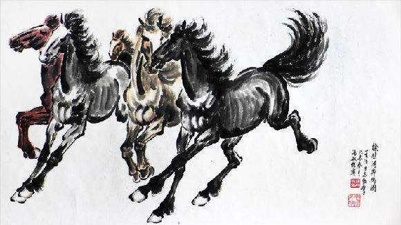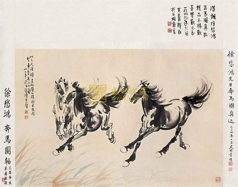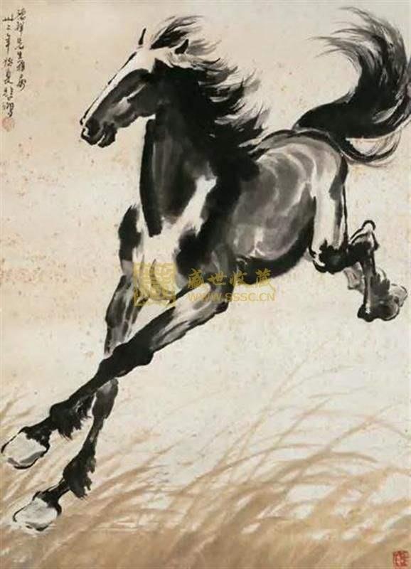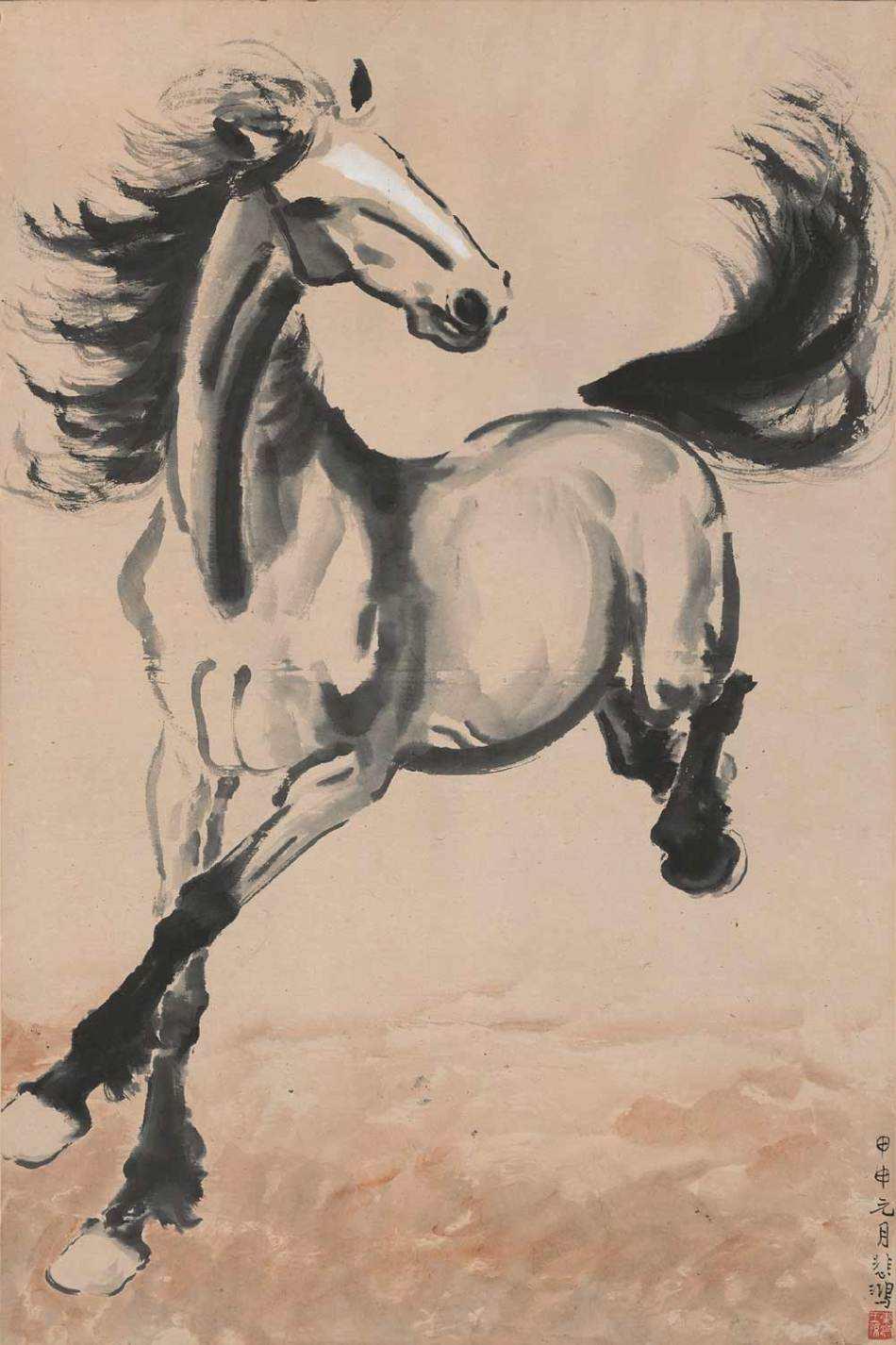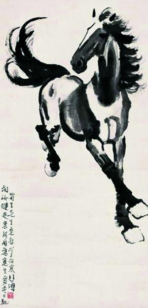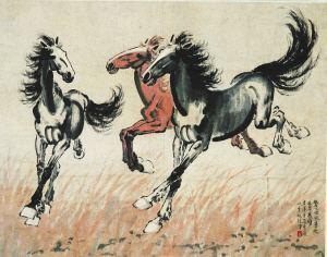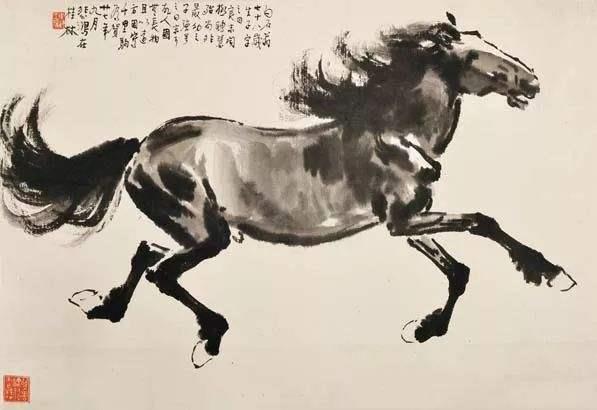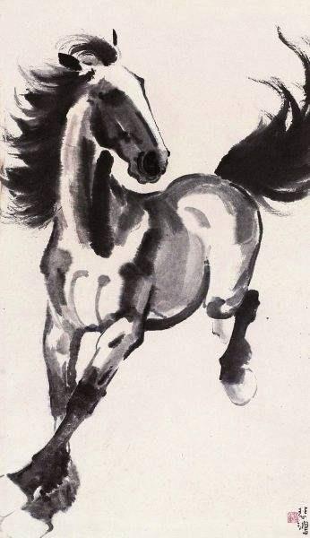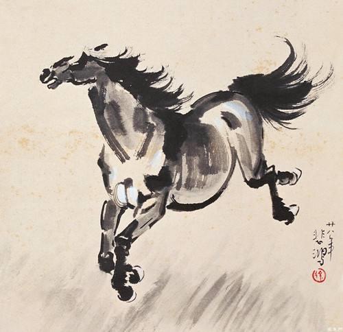 徐悲鸿自幼随父学习绘画,四岁入私塾。后又留洋法国,深得西洋绘画的技法,并系统学习了西方绘画的理论,在西方素描的透视关系、空间关系、光影关系的处理上驾轻就熟,并将西方的绘画理论与东方绘画的技法结合起来,产生了独特的笔墨效果。徐悲鸿所画的奔马图以形神兼备著称,奔马的神韵跃然纸上,整体造型俊朗丰满。