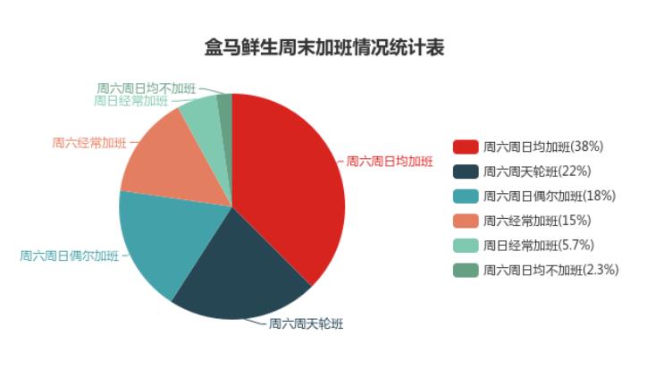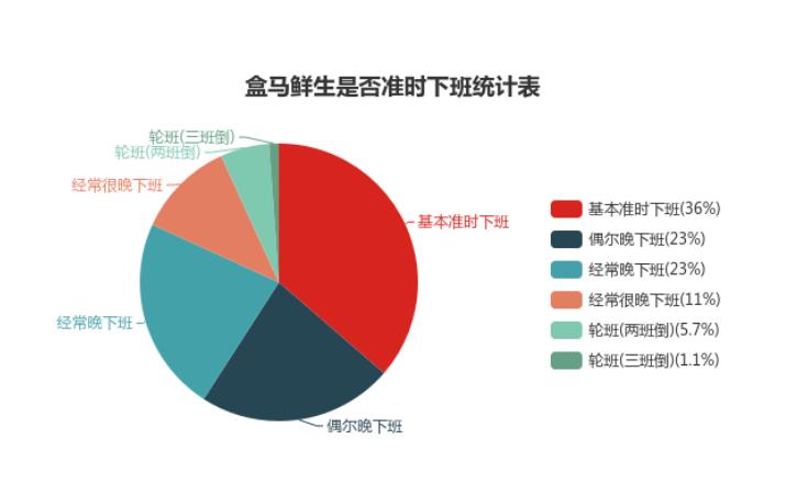 据统计:36%的员工反馈基本准时下班,22%的反馈偶尔晚下班,22%的反馈经常晚下班,11%的反馈经常很晚下班,5%的反馈轮班(两班倒),1%的反馈轮班(三班倒)。