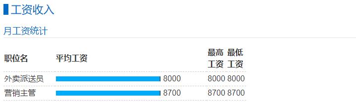 整体薪资统计:外卖员均薪8000元/月,营销主管8700元/每月